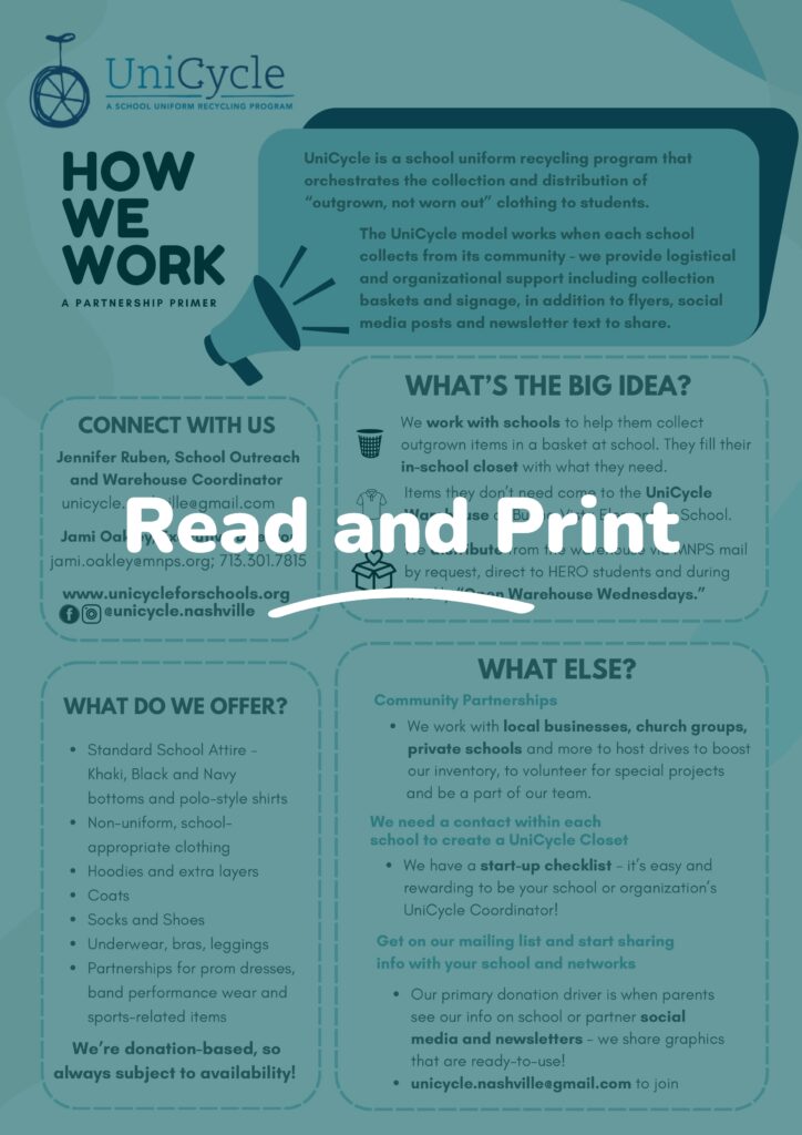 The UniCycle program provides school clothing to students in need within the Metro Nashville Public School (MNPS) system by collecting new and gently-used items in schools and distributing them at the school level and through a partnership with the Homeless Education Resource Office (HERO).